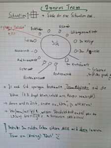 Stimmt, bei meiner Freundin, und dass wir statt Therapie manchmal nur einen REMNDER brauchen, der uns an unsere Ressourcen erinnert, in diesem Fall an das Innere Team Schulz von Thuns, sprich, sofort STOPP zu sagen, wenn der Satz: „Ich bin falsch“ aufpoppt. Und diesem PersönlichkeitsANTEIL, freundlich zuzulächeln, besten Dank, du willst mich schützen, gut, dass es dich gibt, ABER! auch Schicht und Schluss: Keine Macht dem ABSOLUTEN und den ABSOLUTEN IDENTIFIKATIONEN! – Das I beherbergt viele MEs. Siehe mein Flipchartfoto… (ein privat Hingeknalltes, ich geb es zu; die Flips im Business-Coaching sahen ordentlicher aus, dennoch, ich fand auf die Schnelle kein anderes… und somit: Ade, du ewige schreiender Perfektionistenanteil…).